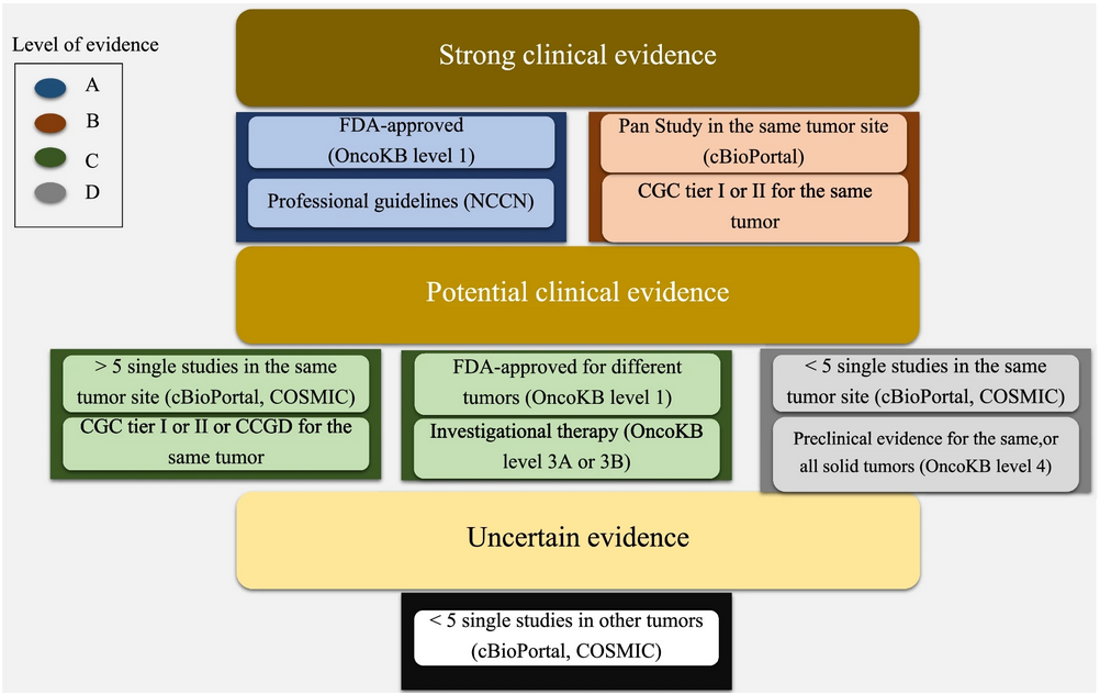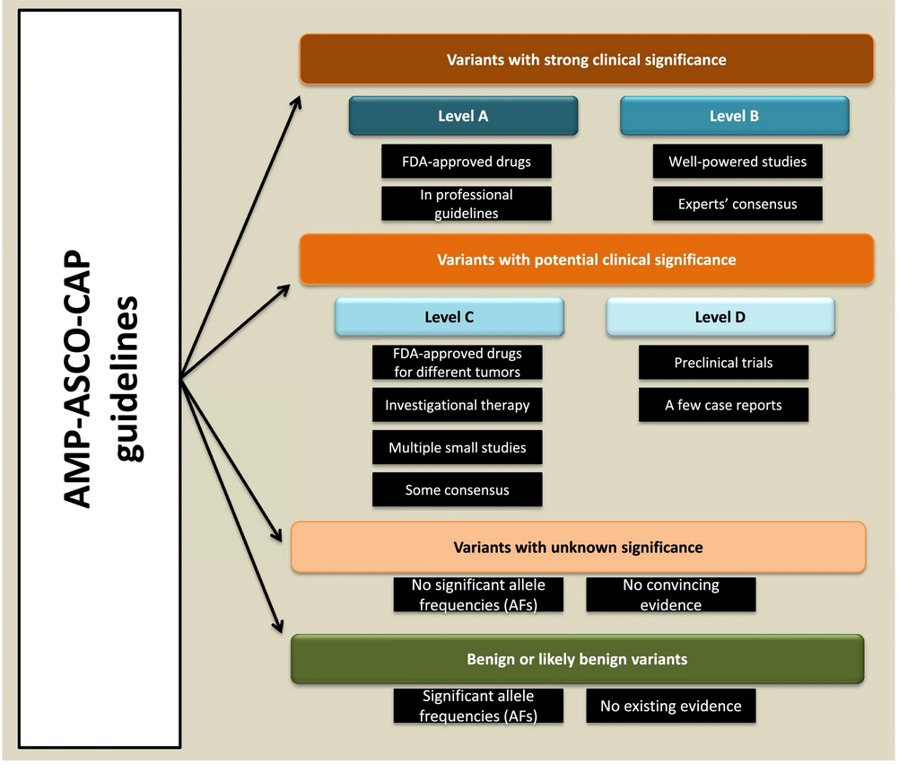 The AMP-ASCO-CAP guidelines provide a structured four-tier system to classify cancer-related genetic (somatic) variants based on clinical and genomic evidence. These classifications help prioritize genetic findings for clinical actionability. Here's a breakdown of the evidence levels: